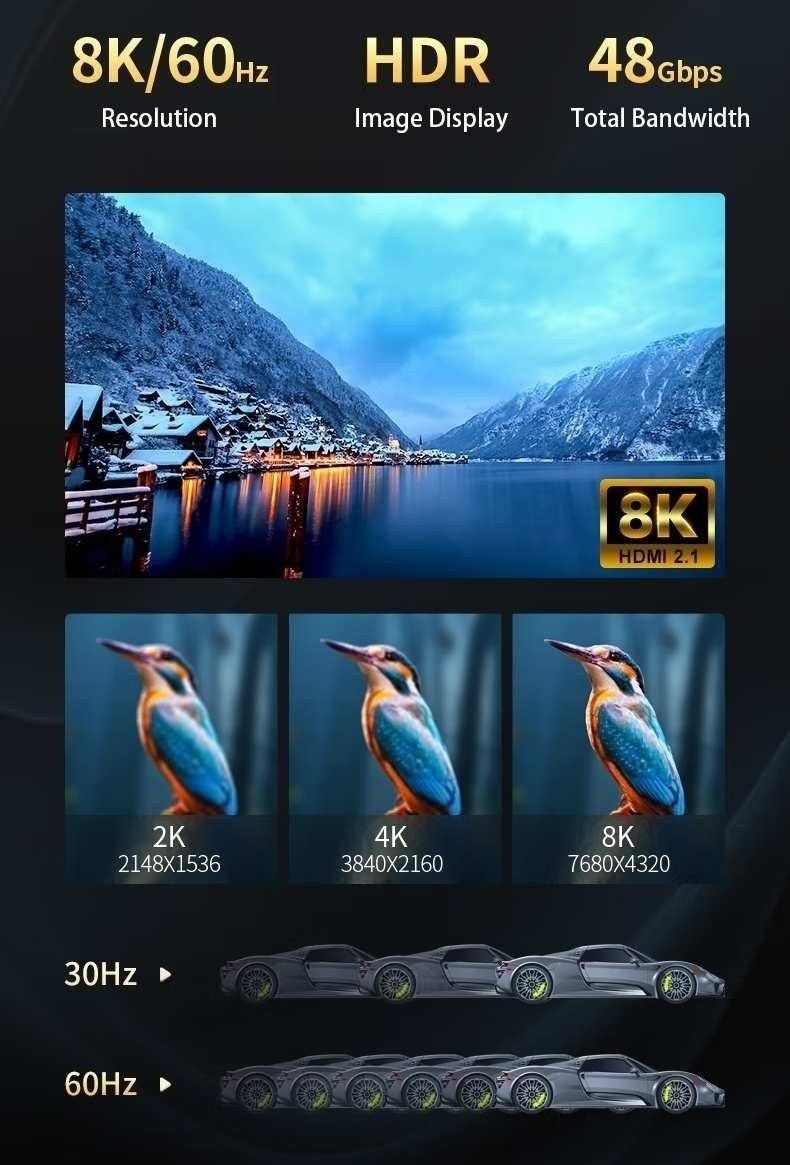 Optický HDMI 2.1 Ultra High Speed 8K@60Hz alebo 4K@240Hz kábel slúži na prepojenie dvoch audio/video zariadení prostredníctvom moderného rozhrania HDMI, ako napríklad HD-DVD/BluRay prehrávača a LCD/Plazma televízora. Kábel prenáša digitálny zvuk aj obraz a podporuje digitálnu ochranu obsahu HDCP.Kábel obsahuje aktívnu elektroniku, ktorá funguje iba v jednom smere signálu. Kábel sa musí vždy zapájať pri vypnutých zariadeniach a to len v smere vyznačenom na kábli. Konektor označený „Source“ sa vždy pripája k vysielaciemu zariadeniu (počítač, DVD, Blu-ray). Konektor označený „Display“ sa vždy pripája k zobrazovaciemu zariadeniu (LCD, televízor, projektor).