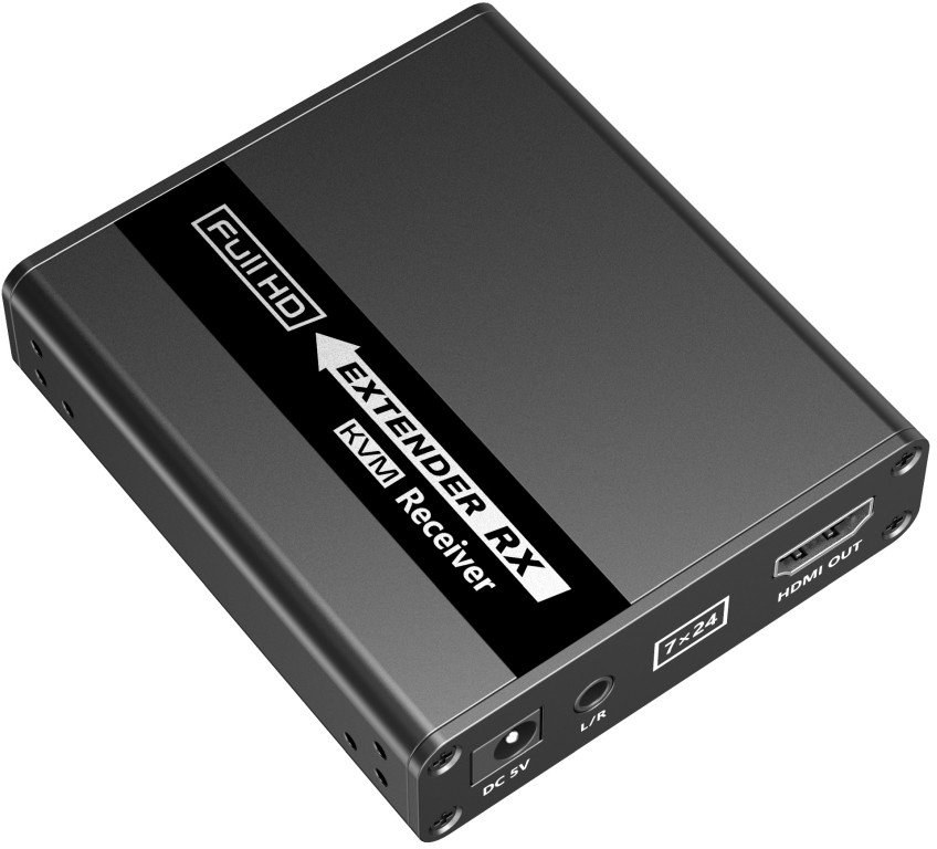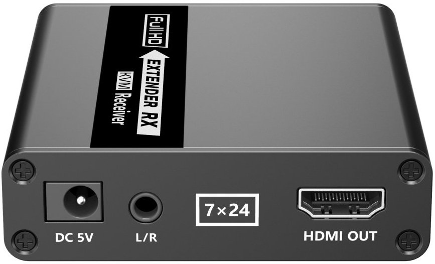 - Konektory na prijímači: HDMI výstup, 2x USB výstup, konektor RJ45 na prepojenie s vysielačom, napájací konektor, stereo jack 3,5 mm audio výstup