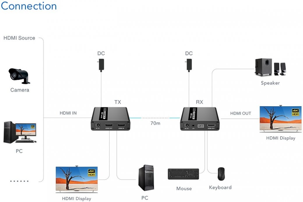 Toto zariadenie HDMI Extender umožňuje prenášať signál HDMI na veľké vzdialenosti pomocou sieťového kábla CAT6/6A/7. Vďaka použitiu sieťového kábla je možné dosiahnuť až 70 metrov prenosovej dĺžky s rozlíšením 4K FULL HD 1080p videa a prenášať zároveň USB (napríklad klávesnicu, myš alebo iné USB periférie)