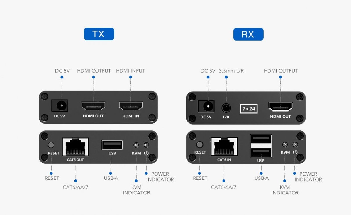 - Konektory na vysielači: HDMI vstup, HDMI výstup pre lokálny monitor, USB vstup, konektor RJ45 na prepojenie s prijímačom, napájací konektor