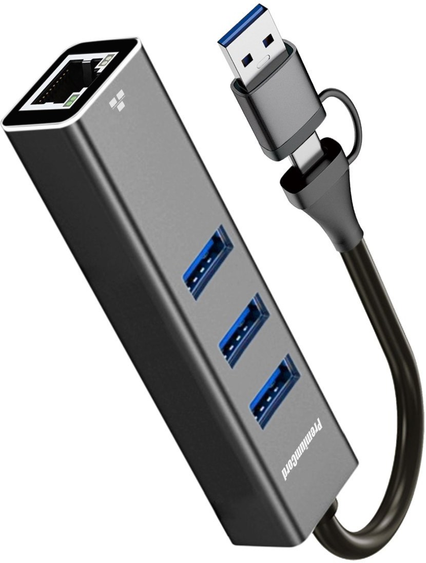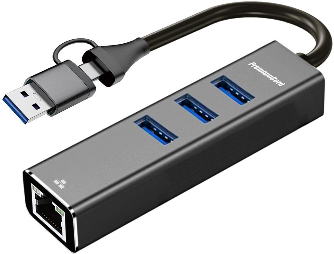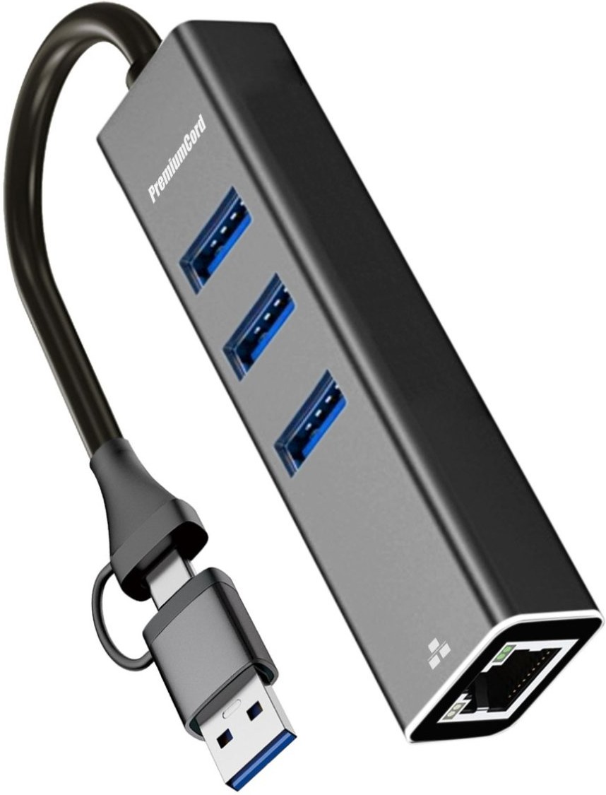 PremiumCord USB-A a USB-C Hub na LAN 10/100/1000Mbps + 3x USB 3.2 ktorý umožňuje pripojiť váš počítač s portom USB typu C k internetu alebo k lokálnej sieti pomocou kábla s konektorom RJ45. Zároveň umožňuje pripojiť tri periférne zariadenia cez USB 3.2, ako napríklad USB disk, tlačiareň, klávesnicu alebo myš.Technické parametre