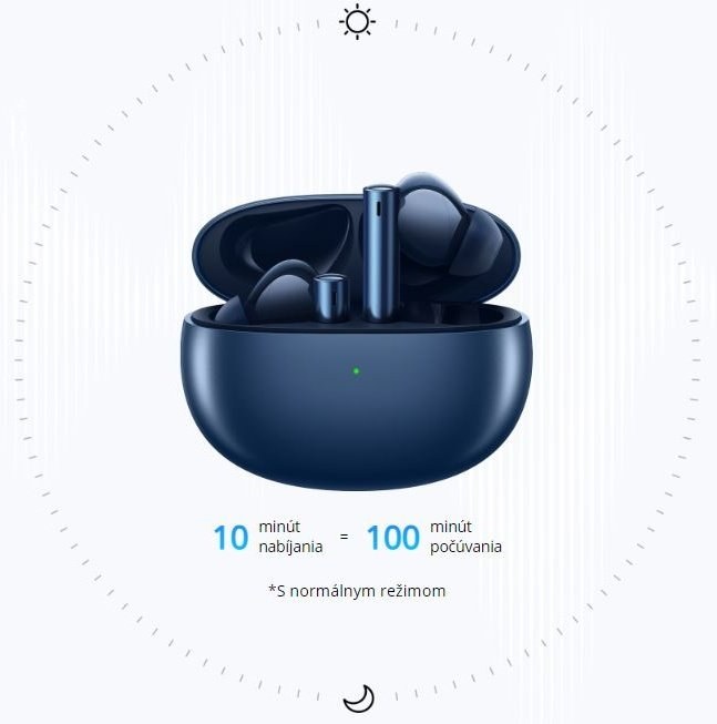 Nabíjací box nabije slúchadlá: 1 hodina na úplné nabitie; 10 minút na 100 minút prehrávania s nabíjacím puzdrom (pri 50 % hlasitosti s normálnym režimom)