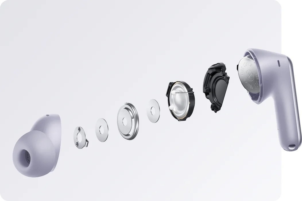 Nastaviteľné úrovne potlačenia hluku - Úrovne potlačenia hluku možno ľahko upraviť. Pre optimalizovaný zážitok sú ponúkané aj adaptívne režimy okolia a zvukovodu. Algoritmus, ktorý je prispôsobený pre každú jedinečnú situáciu v uchu, inteligentne identifikuje štruktúru zvukovodu a stav nosenia, aby automaticky optimalizoval parametre potlačenia hluku pre prispôsobený zážitok.Tri mikrofóny a potlačenie hluku AI pre hovory
