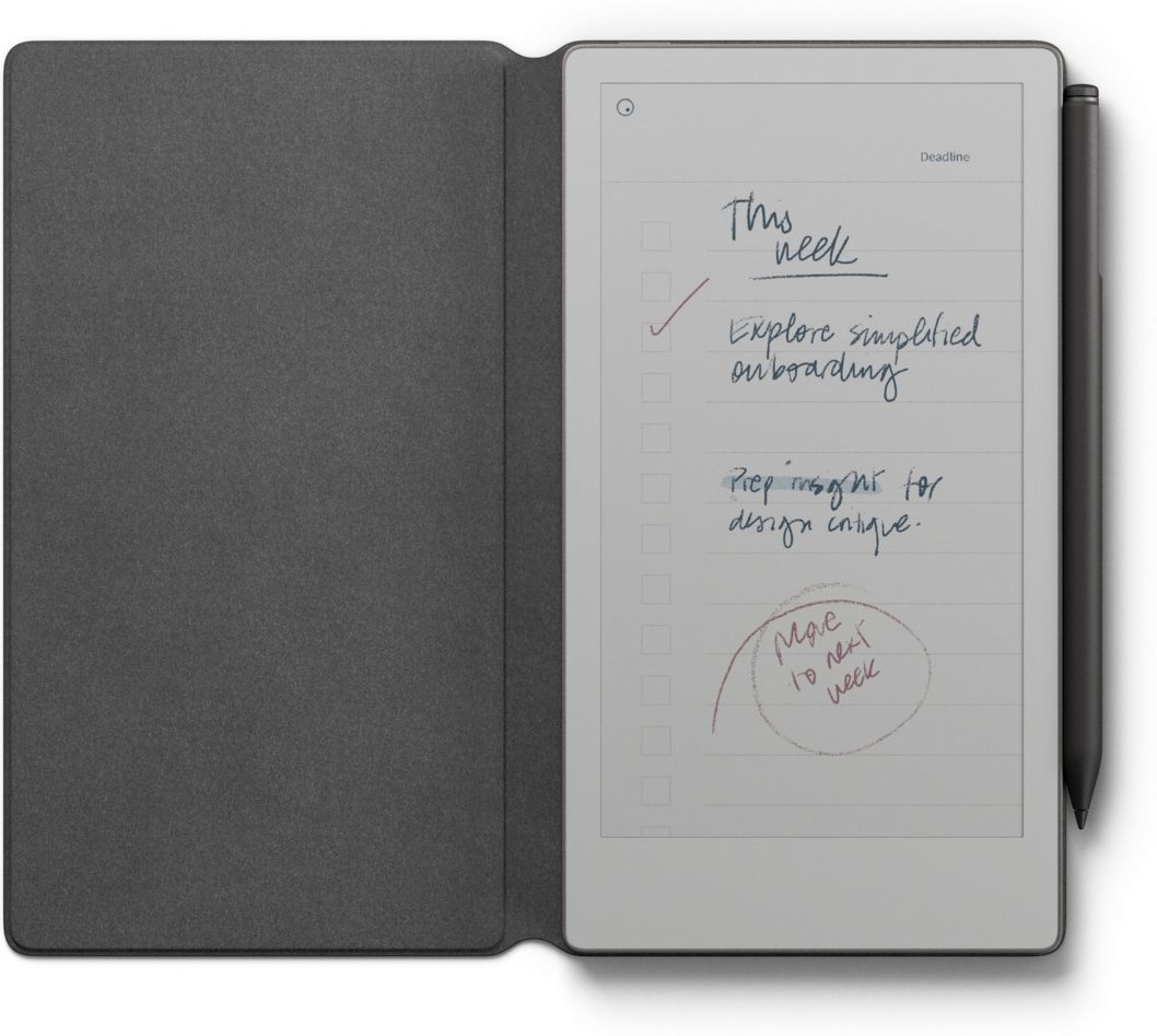 Folio sa otvára ako klasická kniha a jeho predná strana sa dá úplne prehnúť dozadu, čím vytvára ideálne podmienky na písanie. Vnútro je vystlané jemným mikrovláknom, ktoré chráni displej pred poškriabaním. Vďaka automatickému uzamykaniu a prebúdzaniu pri otvorení alebo zatvorení obalu je používanie tabletu intuitívne a bez zbytočných krokov. Navyše, magnetický popruh na stylus (Marker alebo Marker Plus) zabezpečí, že vaše pero bude vždy po ruke.Štýlový doplnok, ktorý vydrží