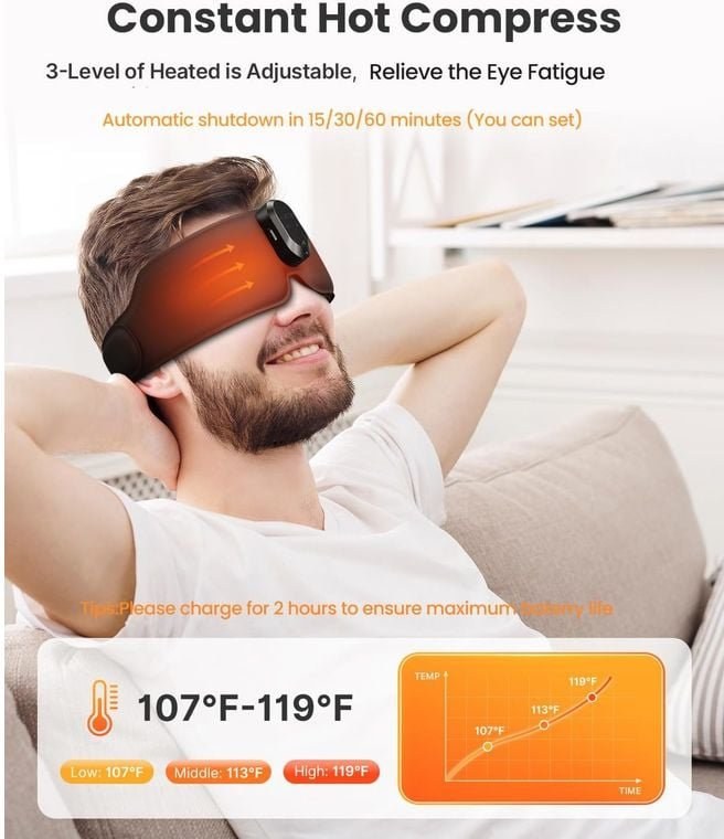 Maska ponúka tri nastaviteľné teplotné režimy, ktoré pomáhajú stimulovať krvný obeh a zmierniť opuchy alebo tmavé kruhy pod očami. Vďaka inteligentnému časovaču (15, 30 alebo 60 minút) môžete pokojne zaspať bez obáv – zariadenie sa po uplynutí nastaveného času automaticky vypne.
