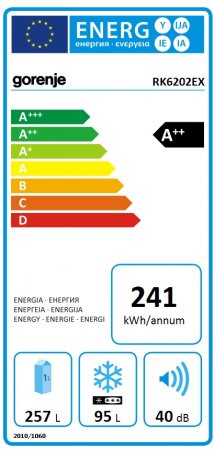 RK 6202 EX, Kombinovaná chladnička, Prevedenie (farba): Nerez (Inox look), Otváranie dvierok: Ľavé/pravé otváranie dverí, Triedy klímy: ST, N, T, 1 kompresor, Objem chladničky/mrazničky: 257/95 l, Mraziaca kapacita: 4,5 kg / 24h, Skladovací čas pri výpadku el. energie: 30 h, Mechanicky nastaviteľná teplota, Slot-in: možnosť vložiť spotrebič do kuchynského výklenku 60 cm, FrostLess: Menej ľadu v mrazničke, SimpleSlide výškovo nastaviteľné police vo dverách: 3, LED osvetlenie,Držiak na fľaše, Zásuvka FreshZone, MoistControl regulácia vlhkosti, XXL SpaceBox zásuvka v mrazničke, Energetická trieda: A++, Spotreba el. energie, kWh/rok: 241 kWh, Úroveň hluku dB (A) re 1 pW: 40 dB, Rozmery výrobku (vxšxh): 200 × 60 × 64 cm