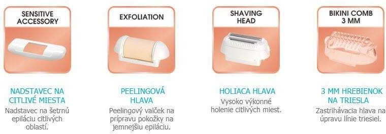 Súčasťou balenia je nastaviteľný hrebeňový nadstavec k holiacej hlave. Nechýba ani nadstavec pre jemnú epiláciu citlivých partií. Pokiaľ chcete zabrániť zarastaniu chĺpkov, použite exfoliačný valček. K dispozícii vám bude tiež čistiaca kefka a puzdro, do ktorého môžete všetko vybavenie bezpečne uschovať.Technické parametre: