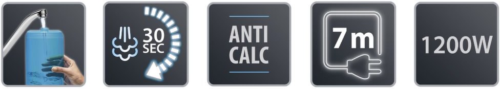 parný čistič, farba čierna, objem 0,6 l, príkon 1200 W, elektrické napätie 230 V, čas zahrievania 30 sekúnd, dĺžka kábla 7 m, teleskopická rúčkaZobraziť viac