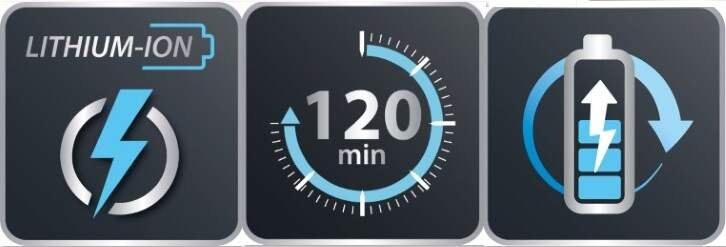 Doprajte si 2 mesiace zastrihávania bez starostí a dobíjania zastrihávača brady. Môžete byť úplne bez obáv vďaka šikovnému ukazovateľu nízkeho stavu batérie. Lítium-iónová batéria poskytuje 120 minút nepretržitej prevádzky.