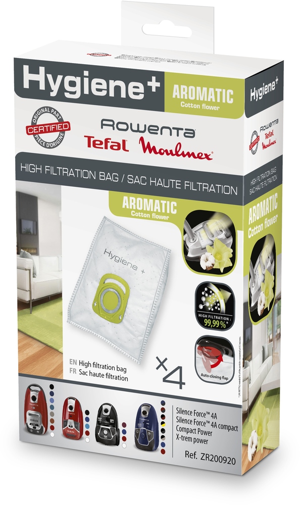 Textilné vrecko s vôňou špeciálne vyvinuté pre rad vysávačov Rowenta Silence Force 4A.Sáčky Rowenta ZR200940 Hygiene + Aromatic Cotton Flower zaručujú 99,99% filtráciu. Vďaka automatickému uzáveru už vás neprekvapí oblak prachu pri jeho výmene.