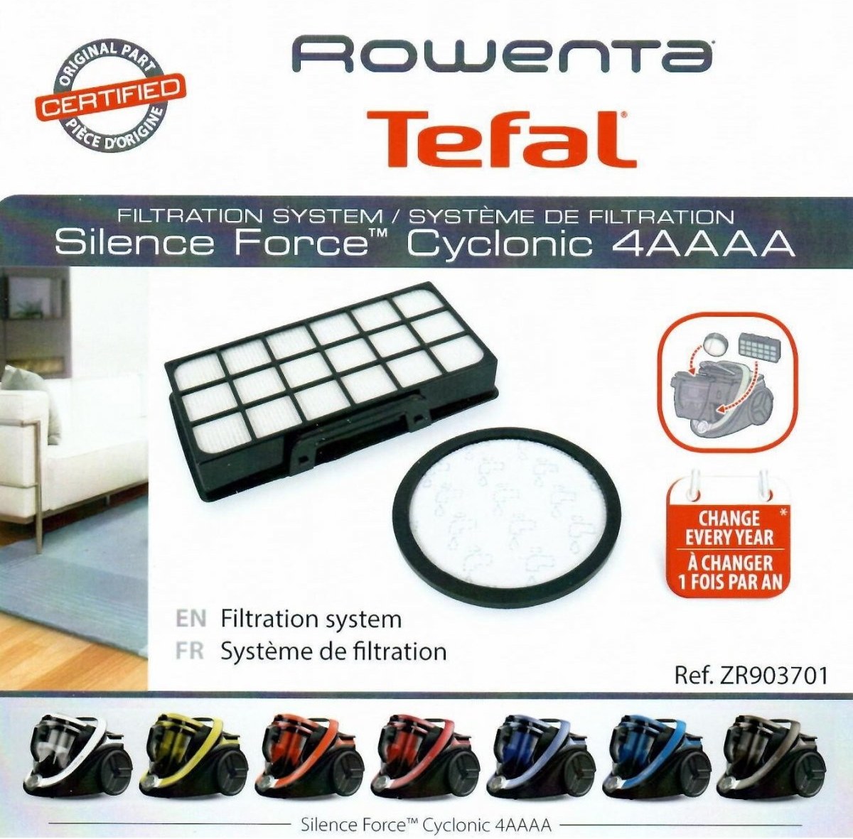 Penový filter umiestnený pred motorom, vysokoúčinný filter umiestnený hneď pred výstupom vzduchu, vďaka čomu zachytí aj najmenšie prachové častice vypúšťané motorom. Odfiltruje až 99,98 % povysávaného prachu.určené pre vysávače Rowenta Silence Force Cyclonic 4A- RO76*