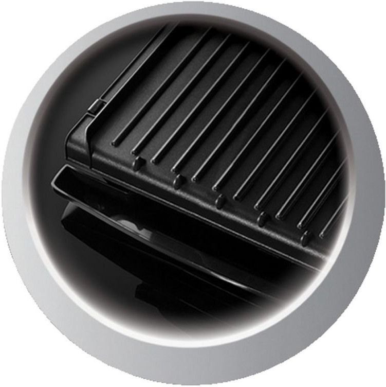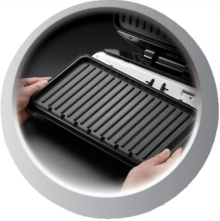Entertaining gril s odnímateľnými plochami, na prípravu až 6 porcií (640 cm2), odnímateľné grilovacie plochy vhodné do umývačky, nastaviteľná teplota, drážky pre odvádzanie prebytočného tuku do odkvapkávacej misky - odstraňuje až 42% tuku, plávajúce pánty sa prispôsobí rôzne hrúbke pripravovaných potravín, indikátor zapnutia a pripravenosti.- Na prípravu až 6 porcií (640 cm2)