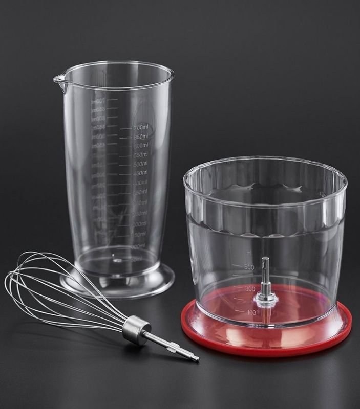 - Súčasťou balenia 700ml nádoba, 500ml nádoba na sekanie, nadstavec na šľahanie a nerezová mixovacia noha s nerezovým nožom