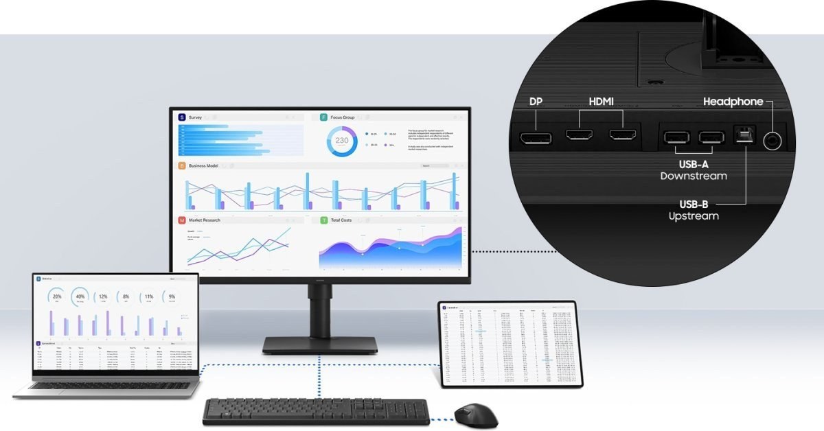 Samsung Essential S4 ponúka bohatú konektivitu vrátane 2× HDMI (1.4), 1× DisplayPort (1.2), 2× USB 2.0, USB-B upstream a slúchadlového výstupu. Vďaka tomu jednoducho pripojíte počítač, notebook alebo ďalšie zariadenia. Monitor podporuje aj funkcie ako Auto Source Switch, Off Timer Plus či Game Picture Mode, ktorý optimalizuje nastavenia obrazu pre rôzne herné žánre.