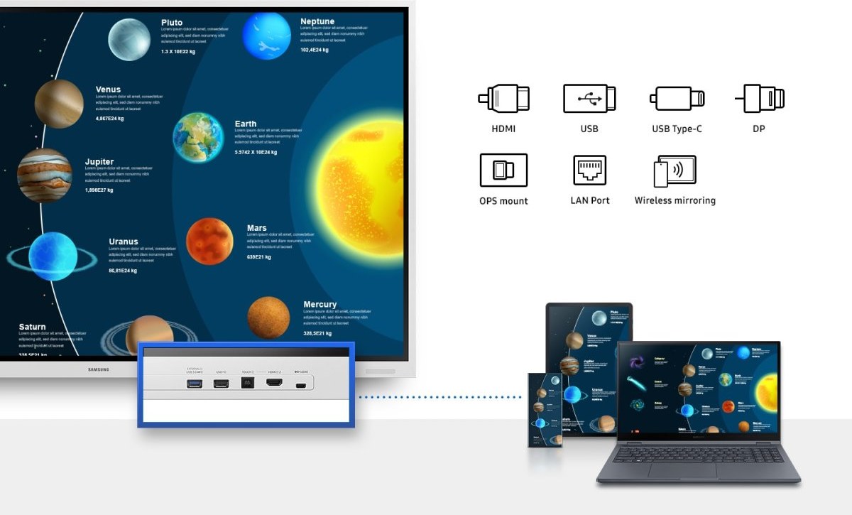 Displej je vybavený širokou škálou portov vrátane HDMI, USB a bezdrôtových možností pripojenia. Podporuje zdieľanie obrazovky cez AirPlay, Miracast či Samsung SmartView, čo umožňuje jednoduché prepojenie s notebookmi, tabletmi alebo smartfónmi. Vďaka kompatibilite s rôznymi operačnými systémami je Flip Pro ideálnym riešením pre hybridné pracovné prostredie.