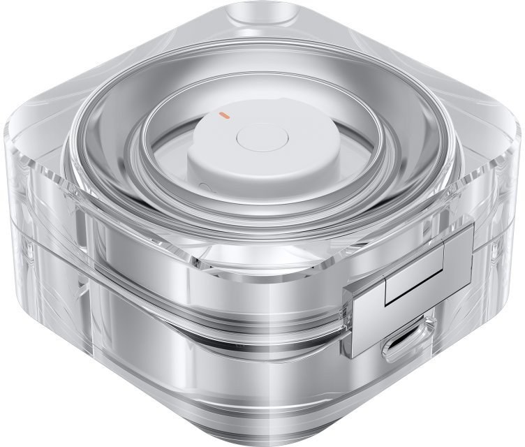 Na prsteň Galaxy Ring je krásny pohľad aj pri jeho vložení do krištáľovo čistého nabíjacieho puzdra. Jemná žiara svetla okolo viacúčelového tlačidla navyše šikovne indikuje úroveň nabitia batérie. Nabíjacie puzdro je možné nabíjať aj bezdrôtovo, takže keď si práve na cestách, stačí prsteň Galaxy Ring bezpečne umiestniť do puzdra a pre ľahké doplnenie energie ho položiť na bezdrôtovú nabíjaciu podložku.