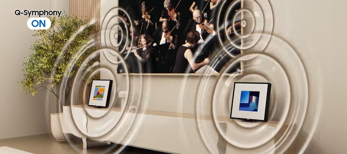 Unikátna technológia Q-Symphony umožňuje, aby TV a Music Frame hrali spoločne bez toho, aby sa niektorý z reproduktorov stlmil. Dopraj si špičkový zvukový systém s plynulou synergiou audia prúdiaceho z viacerých zdrojov.