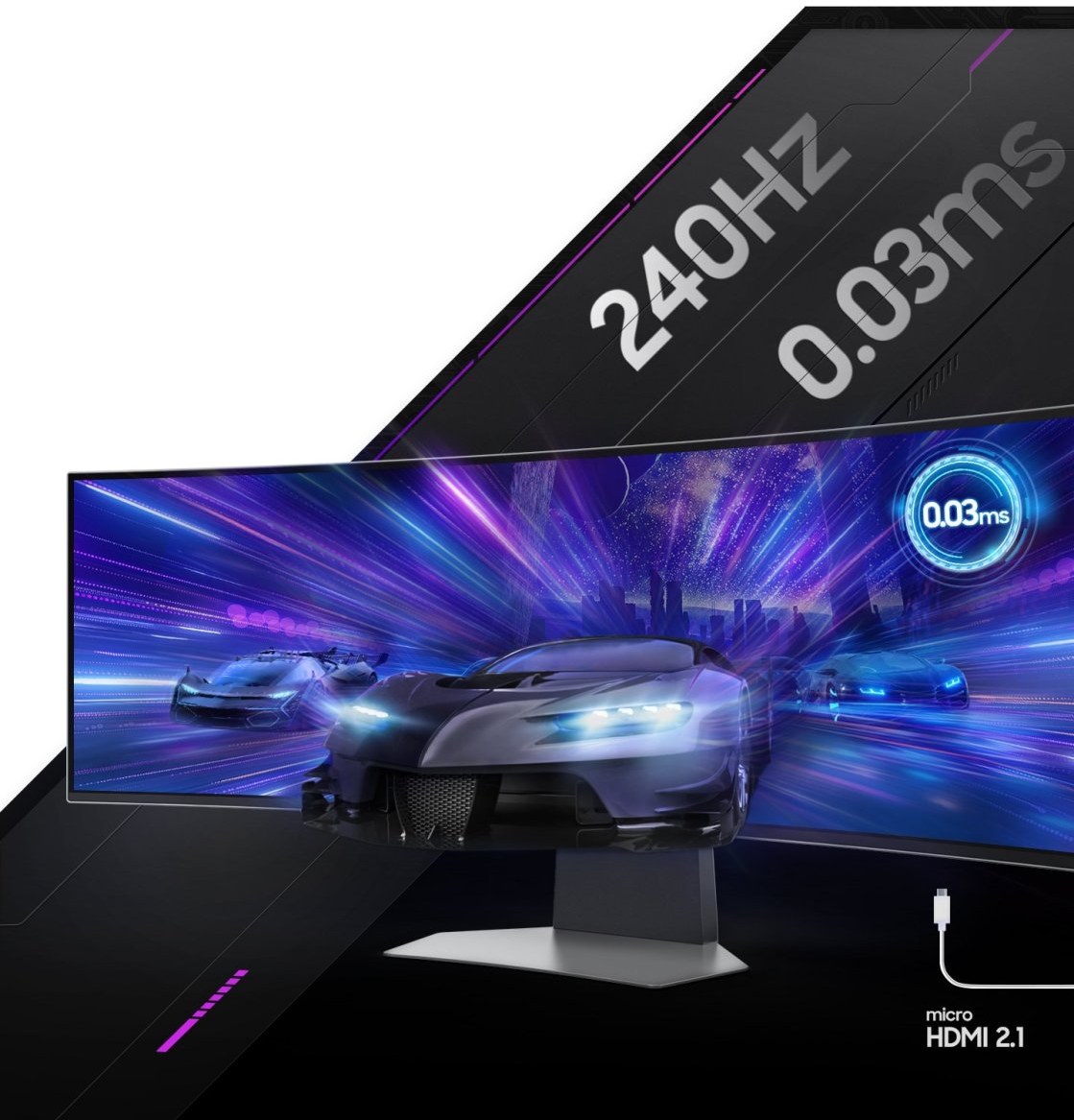 Chytrý herný prehnutý OLED monitor s uhlopriečkou 49" a rozlíšením 5120 × 1440 obrazových bodov ponúka jas 250 cd/m2 a dobu odozvy neuveriteľných 0,03 ms. Obnovovacia frekvencia 240 Hz spolu s podporou technológie AMD FreeSync Premium Pro ponúka alebo rozmazávanie obrazu pri pohybe. Pre prehrávanie obsahu z USB médií sú prítomné tri USB porty. V neposlednom rade určite poteší vstavané reproduktory s celkovým výkonom 10 W a výškovo nastaviteľný stojan. Pripojenie k internetu je realizované bezdrôtovo cez Wi-Fi. Monitor poháňa operačný systém Tizen.