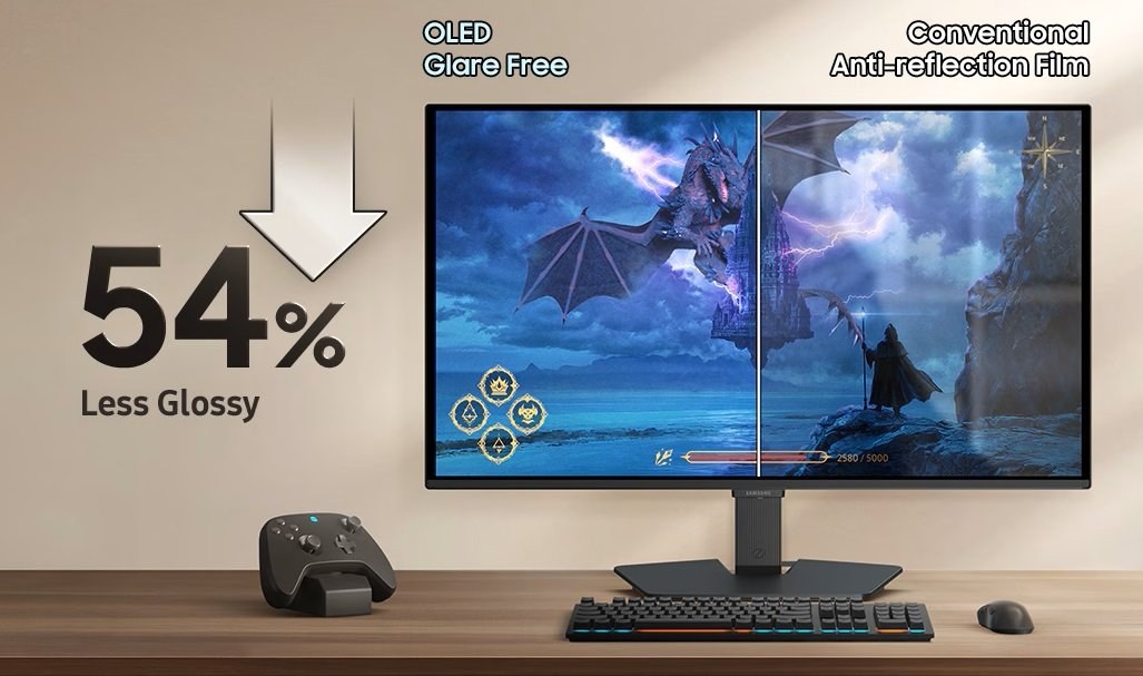 Samsung vybavil tento model pokročilou povrchovou úpravou Glare Free, ktorá v porovnaní s bežnými antireflexnými vrstvami znižuje lesk až o 54 %. To umožňuje sústredené hranie aj v jasne osvetlených miestnostiach bez rušivých odrazov. Pre dlhú životnosť OLED panelu je integrovaný systém OLED Safeguard, ktorý aktívne predchádza vypaľovaniu pixelov pomocou tepelnej modulácie a automatickej detekcie statických prvkov, ako sú logá alebo panely úloh.