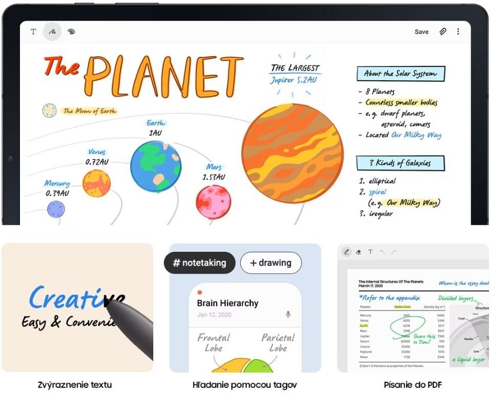 S perom S Pen bude zapisovanie na prednáškach hračka. Poznámky si môžeš robiť priebežne a meniť ich farby podľa potreby. Pri ukladaní ich môžeš úhľadne roztriediť pomocou značiek, čo umožňuje jednoduché spätné vyhľadávanie. Dokonca môžeš vpisovať priamo do PDF súborov, aby si mal všetky zápisky prehľadne usporiadané. Keď príde čas skúšok, budeš mať všetky študijné materiály dokonale zorganizované a pripravené. S Pen je multifunkčný písací nástroj. Vďaka prirodzenému úchopu, nízkej latencii a vysokej citlivosti na prítlak ho môžeš využiť na všetko – od kreslenia až po úpravu dokumentov. A vďaka magnetickému držiaku priamo na tablete sa ti nikdy nestratí.Produktivita ešte nikdy nebola tak flexibilná