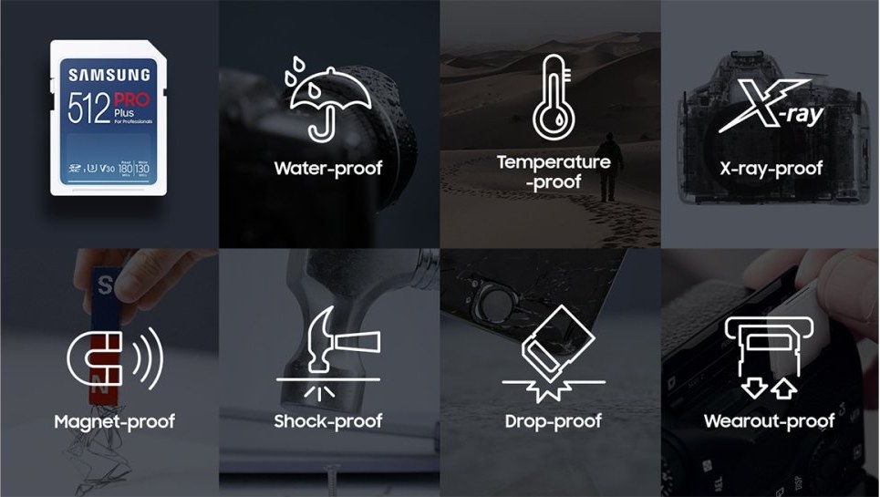 Majte všetky spomienky na jednom mieste. Prispôsobte si úložisko podľa svojich potreb a vybavte sa výkonnou 512 GB, 256 GB, 128 GB alebo 64 GB SD kartou. Vďaka tejto velkorysej ponuke máte vždy k dispozícii dostatok priestoru na uloženie všetkého obsahu.Spoľahlivá po všetkých stránkach
