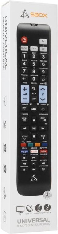SBOX RC-01400 je univerzálny diaľkový ovládač 4v1, ktorý umožňuje ovládať rôzne zariadenia, vrátane CBL/SAT/DVD/BD. Stačí vložiť 2× AAA batérie (nie sú súčasťou balenia) a môžete pohodlne ovládať svoje zariadenia až zo vzdialenosti 8 metrov. Ovládač je okamžite pripravený na použitie bez nutnosti zložitého nastavovania alebo párovania. Vďaka ergonomickému dizajnu perfektne padne do ruky a ponúka intuitívne rozloženie tlačidiel pre pohodlné ovládanie viacerých zariadení jedným ovládačom.Univerzálna kompatibilita pre rôzne zariadenia