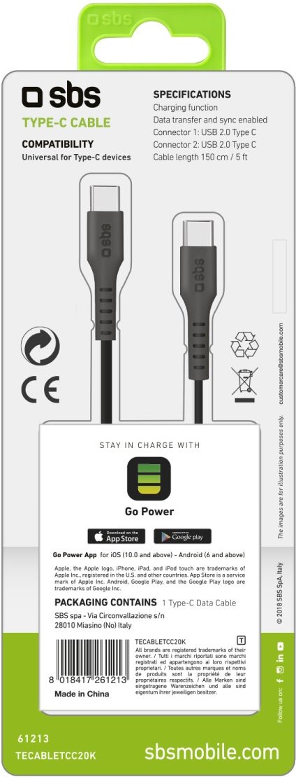 Kvalitný dátový kábel prémiovej značky SBS poskytuje bezproblémový spôsob ako nabíjať, synchronizovať a zálohovať dáta na všetkých zariadeniach s USB-C portom. USB-C je novinkou presadzovanou na najnovších zariadeniach. Jeho silná viacvrstvová konštrukcia a kvalitne spracované konektory zabezpečujú rýchle nabíjanie, vysokú odolnosť a životnosť. Výrobok spĺňa všetky zákonné a bezpečnostné normy SR.Vlastnosti: