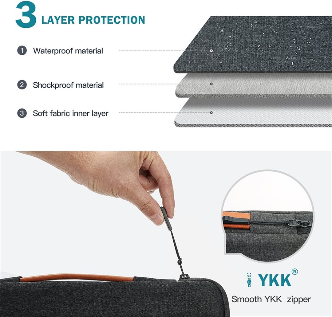 Taška je vyrobená z troch vrstiev textílie - vonkajší vodeodolný materiál, ktorý odolá cákancom vody, strednej nárazu vzdorný materiál a vnútorný mäkký materiál. Vďaka týmto trom textíliám máte istotu, že je vaše zariadenie v bezpečí za všetkých okolností. Rohy tašky sú navyše opatrené ochranou rohov zariadenia.