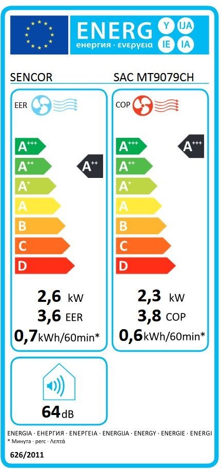 A++ / A+++ – energeticky veľmi úsporná, výkon 9 000 BTU/h chladenie, 8 000 BTU/h vyhrievanie, max. veľkosť miestnosti: 35 m2 / 91 m3 (výška stropu 2,6 m), 5 prevádzkových režimov, 4 rýchlostí