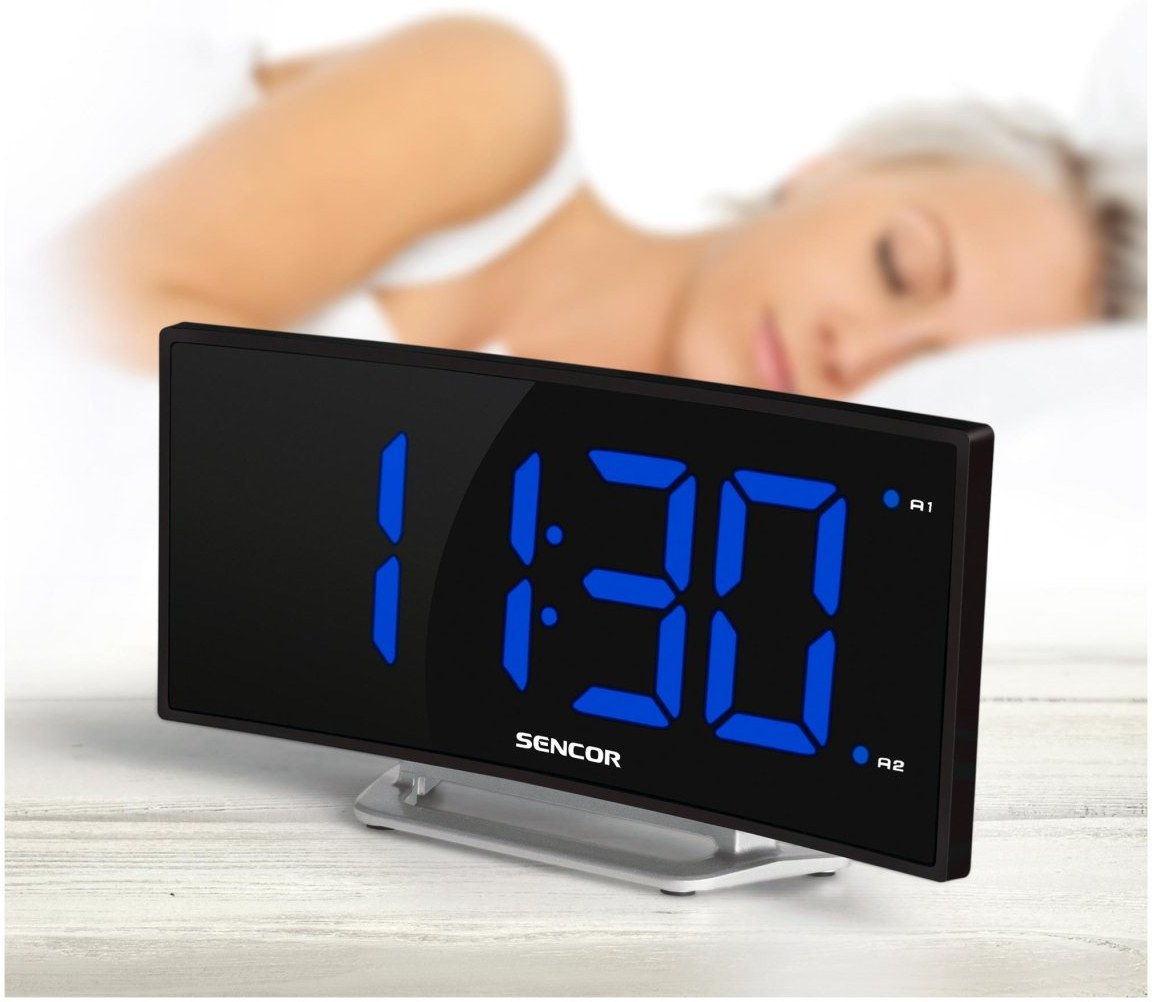 hodiny s budíkom, LED displej so zakrivením, digitálne zobrazenie času, duálny alarm, zosilňujúci budiaci signál, opakované budenie Snooze, 2 úrovne jasu displeja alebo vypnutéZobraziť viac