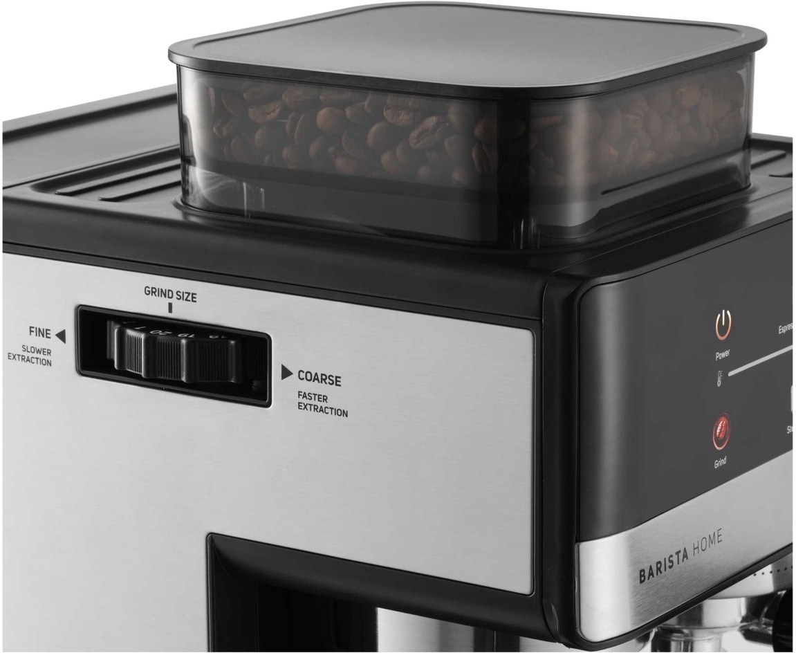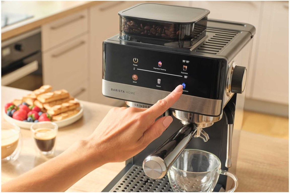 pákový Espresso kávovar so zabudovaným mlynčekom, tlak čerpadla max. 20 bar, objem nádržky 1,8 l, oceľový mlynček, parná tryska, objem zásobníka na kávu 150 g, 20 stupňov mletia, displej, príkon 1350 W, čiernaZobraziť viac