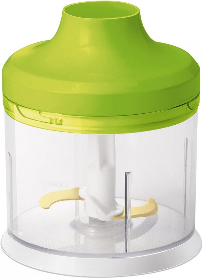 Nasadím rukoväť na nádobu sekáčika a show môže začať! Sekáčik má vlastné nerezové nože, s ktorými dokážem rozdrviť/nasekať prakticky čokoľvek.Akékoľvek tuhšie potraviny od más až po tvrdé syry, ovocie a zeleninu. Z orechov viem vyrobiť múku a rozdrvím ľad. Celý proces viem regulovať podľa požadovanej konzistencie, napr. hrubá, jemná, kaša, triešť.