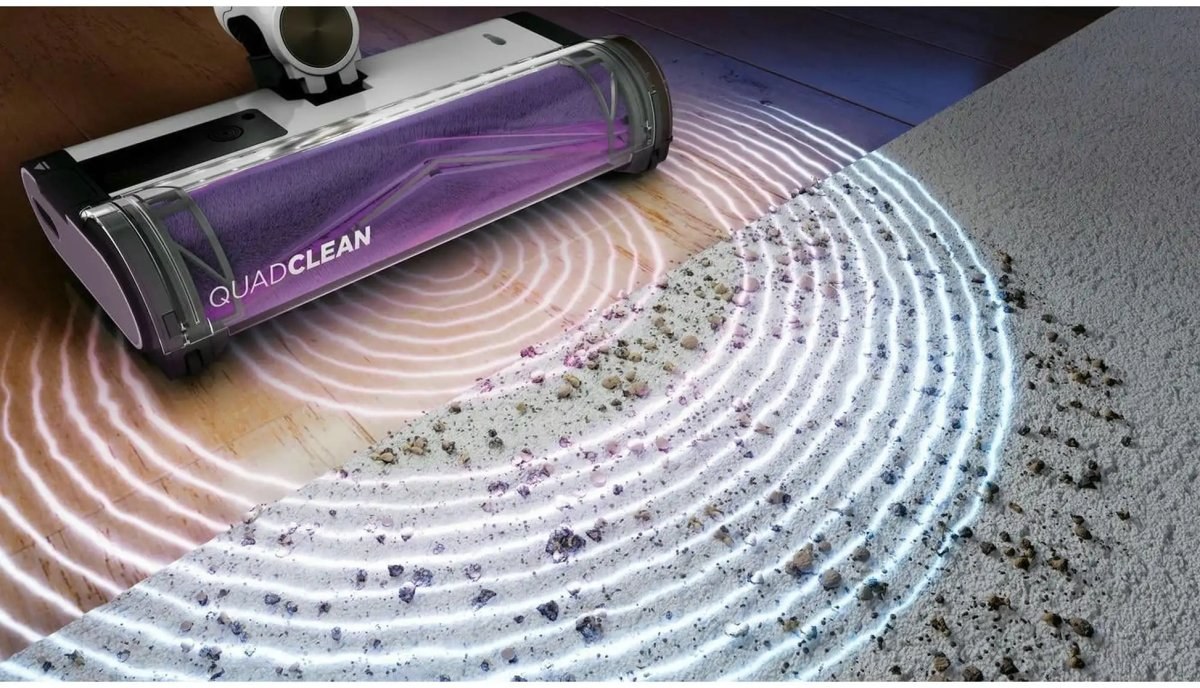 Kefový valec QuadClean na rôzne povrchy intenzívne čistí všetky povrchy. Jeho dizajn má vyvýšený predný okraj na nasávanie veľkých nečistôt, kobercové lamely na nasávanie hlboko usadených nečistôt a vlasov, čistiace rebrá na uvoľnenie jemných nečistôt a mäkké mikrovlákno na zachytenie jemného prachu.