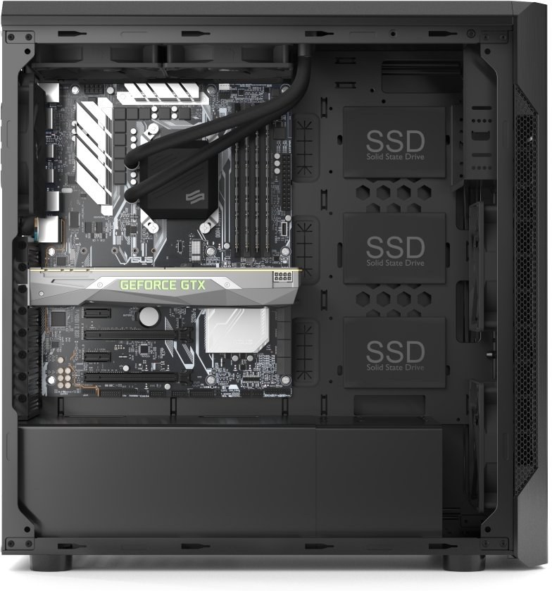 Skriňa formátu ATX ponúka tri 3,5 "pozície pre pevné disky a štyri 2,5" pozície pre SSD disky. Na prednom paneli sa nachádzajú dva USB 3.0 porty, slúchadlový výstup a audio vstup pre mikrofón. Panel s konektormi možno navyše ľubovôle ľahko premiestniť do spodnej časti. Osadená je dvoma 120 mm ventilátormi na čelnej strane a jedným na zadnej strane. Premyslené dispozičné riešenie umožňuje osadenie skrine až siedmimi ventilátormi. Skriňa je dodávaná bez zdroja.Technické parametre