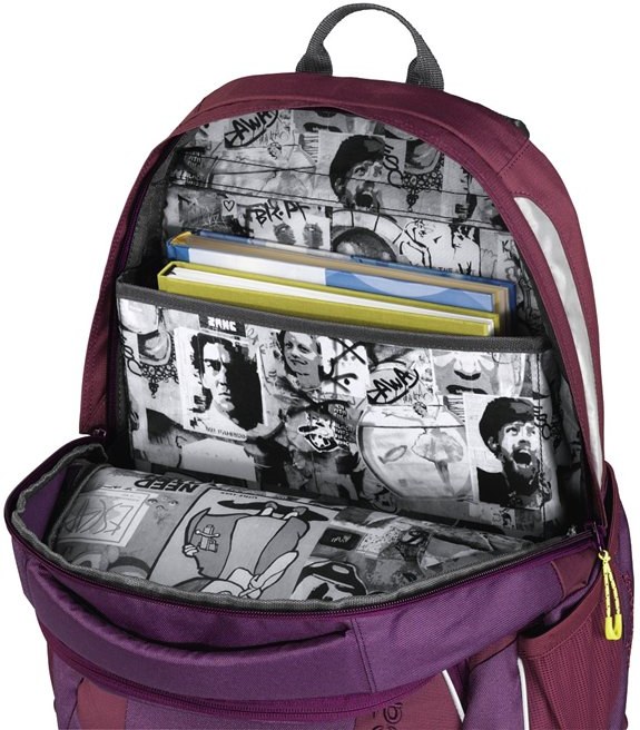 - dve veľké hlavné vrecká poskytujú dostatok miesta pre knihy a zložky až do veľkosti A4, polstrovaný priečinok pre notebook 15,6“
