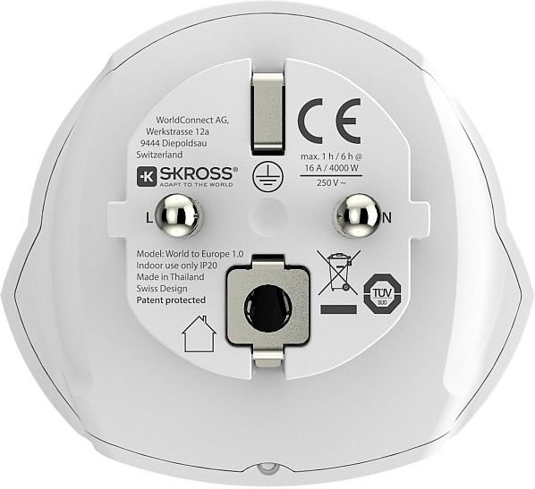 Adaptér SKROSS World to Europe umožňuje bezpečné použitie zariadenia z viac ako 200 krajín v slovenských a európskych zásuvkách typov E a F. Pripojí uzemnené aj neuzemnené vidlice prívodných káblov, bez problémov zapojíte všetko od notebookov, telefónov až po fény.