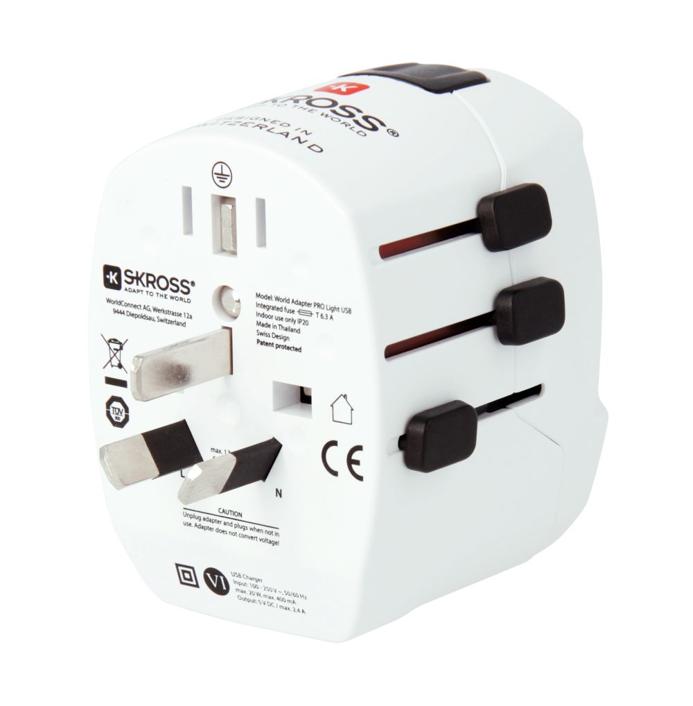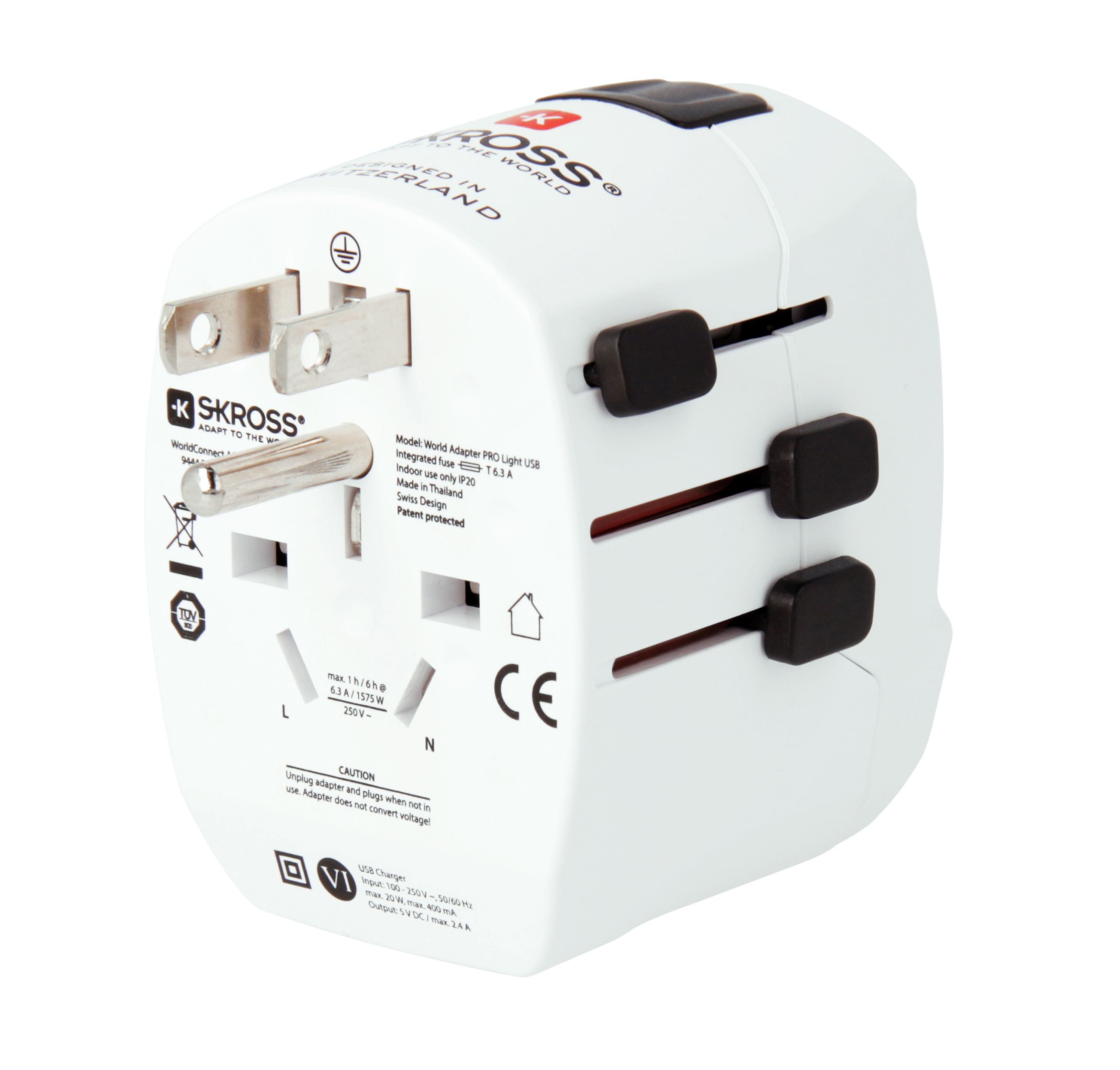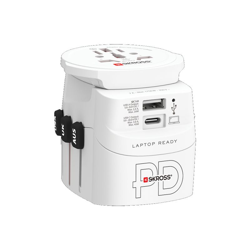 SKROSS PRO Light USB AC45PD – World zaisťuje jednoduché a bezpečné pripojenie zariadenia vo viac ako 200 krajinách. Podporuje dvojpólové aj trojpólové zástrčky a zvládne napájať výkonné spotrebiče, ako sú notebooky či cestovné fény. Vďaka integrovanej nabíjačke s portami USB-C a USB-A je možné súčasne nabíjať viac zariadení.