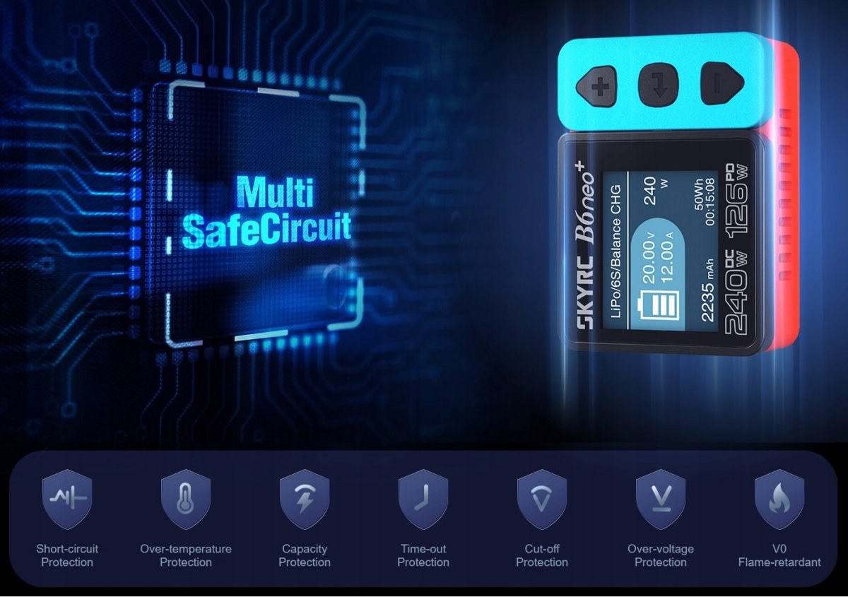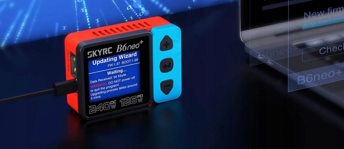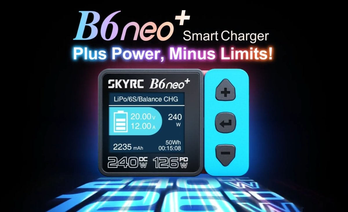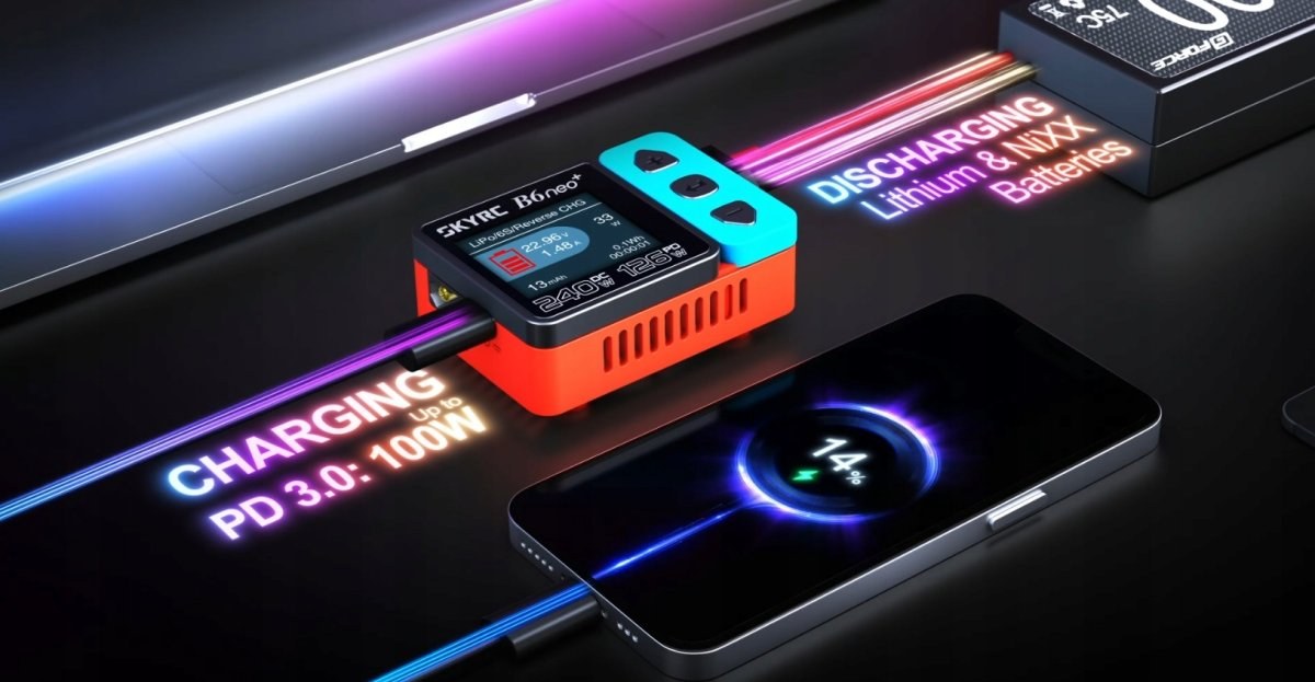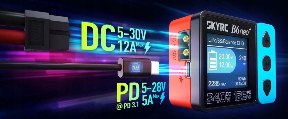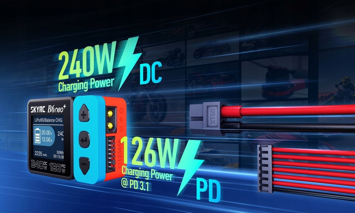Kompaktná a výkonná inteligentná nabíjačka SkyRC B6neo+ je ideálna pre RC modely aj spotrebnú elektroniku. Ponúka nabíjací výkon až 240 W (DC), farebný 1,77" displej, širokú podporu batérií LiPo/LiFe/LiIon/LiHV, NiMH/NiCd a Pb a jednoduché ovládanie. Vďaka USB-C aktualizáciám, vstavanému testeru článkov a tichému chladeniu je skvelou voľbou do dielne aj do terénu.SkyRC B6neo+ kombinuje mobilitu a silu v odolnom PC-ABS V0 tele. Napriek miniatúrnym rozmerom zvláda až 240 W pri napájaní DC a až 126 W pri USB Power Delivery. Prehľadný 1,77" farebný TN displej s rozhraním ColorX zabezpečuje rýchle nastavenie aj čitateľnosť kľúčových údajov o nabíjaní.