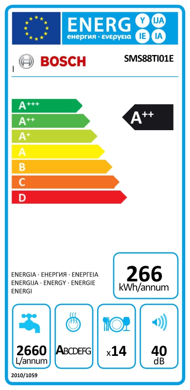 Spotreba energie v programe Eco 50: 266 kWh / rok na základe 280 štandardných umývacích cyklov (napojenie na studenú vodu) a spotrebe v režimoch s nízkou spotrebou energie. Skutočná spotreba energie závisí od spôsobu používania spotrebiča.