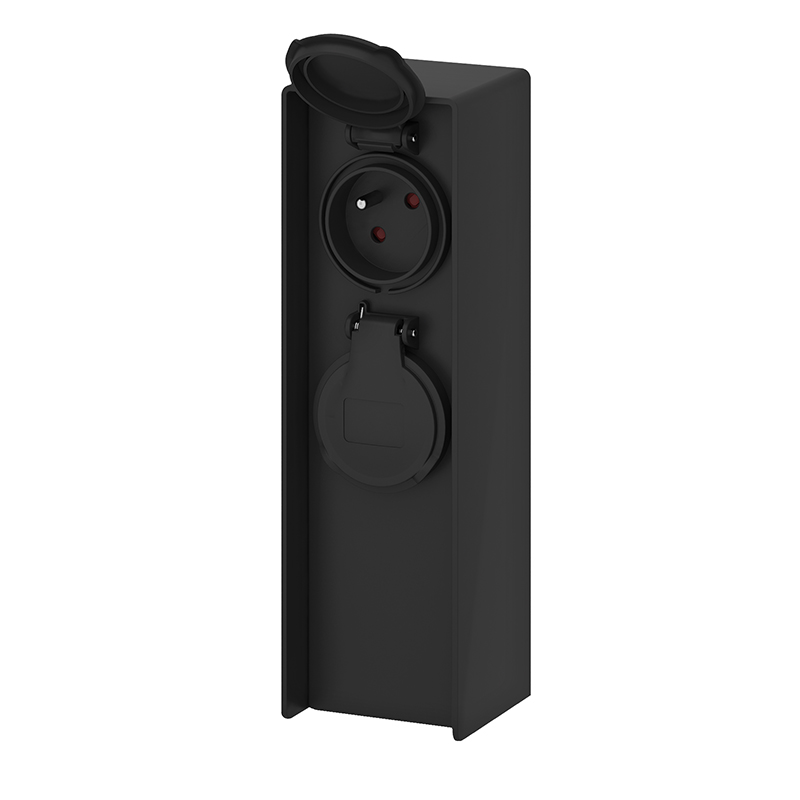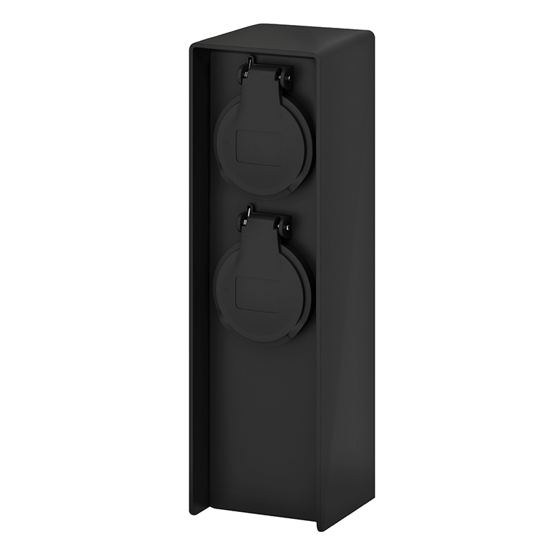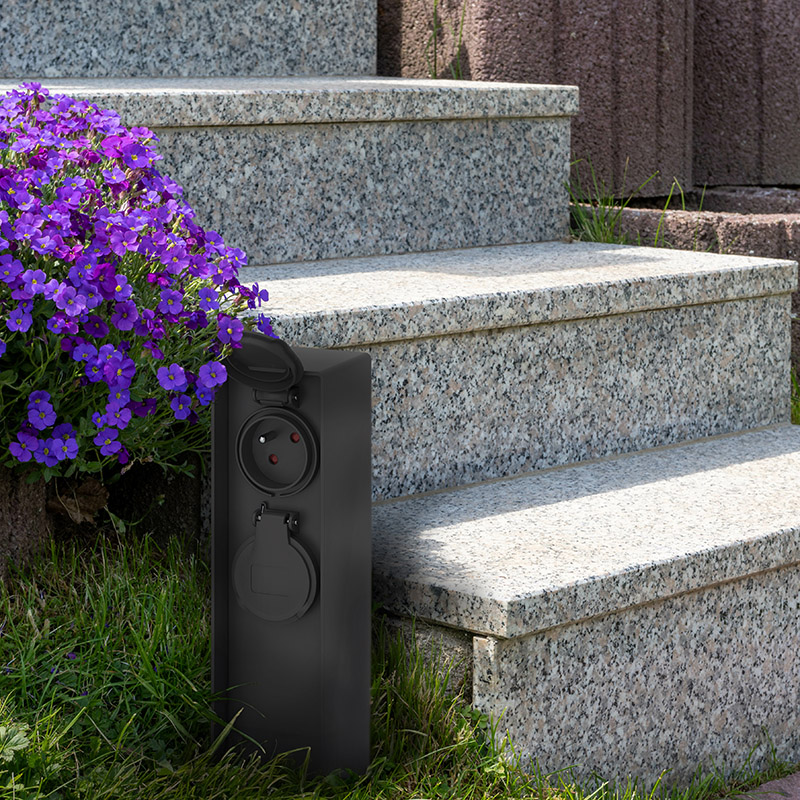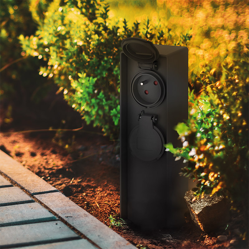 Dve zásuvky s detskými poistkami sú chránené samouzatvárateľnými krytkami proti vlhkosti a prachu. Vďaka krytiu IP44 je stĺpik vhodný aj na použitie za menej priaznivého počasia. Čierne prevedenie pôsobí nenápadne a zapadne do každého vonkajšieho priestoru.