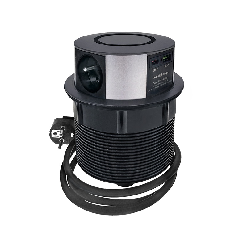 Blok sa inštaluje do výrezu v doske stola a fixuje pomocou skrutkovacieho mechanizmu. Jemným stlačením sa vysunie nad plochu, po dokončení práce sa dá ľahko zasunúť späť. Pneumatický výsuvný mechanizmus zaisťuje plynulý elegantný pohyb. Vrchný kryt v zasunutom stave chráni zásuvky aj nabíjacie porty pred prachom a neruší celkový vzhľad interiéru.