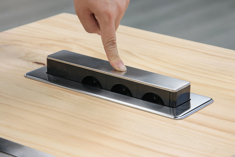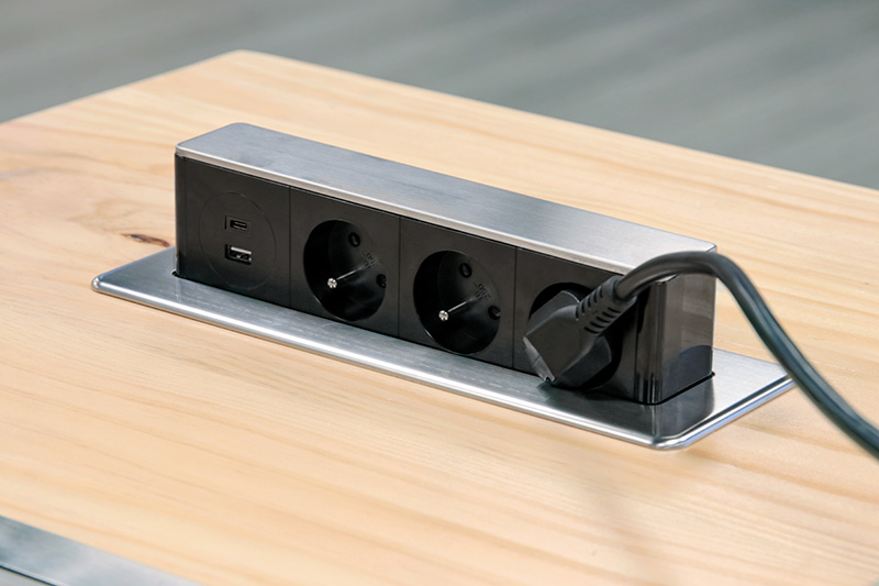 Výsuvný blok so zásuvkami je praktickým doplnkom pre pracovné dosky a stoly, ktorý umožňuje ľahký prístup k elektrickým prípojkám iba vtedy, keď je to potrebné. Tým šetrí miesto a udržuje pracovnú plochu prehľadnú. Vrchný kryt z nerezovej ocele v striebornej farbe dodáva moderný vzhľad a zaisťuje odolnosť voči každodennému používaniu.