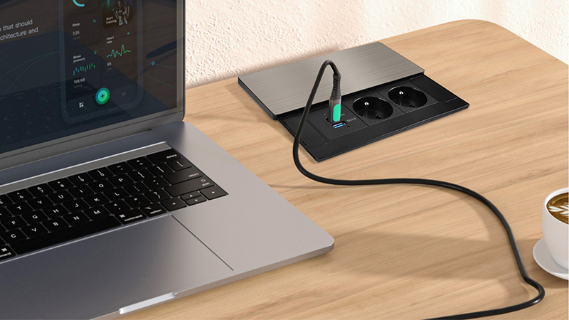 Vrchný kryt z matnej tmavej nerez ocele (inox) pôsobí elegantne a prirodzene zapadne do moderného interiéru. Nízky profil, čisté línie a nenápadné posuvné otváranie zachovávajú vzhľad pracovnej plochy. Zásuvky aj nabíjacie porty sú kedykoľvek ľahko prístupné jednoduchým pohybom ruky.