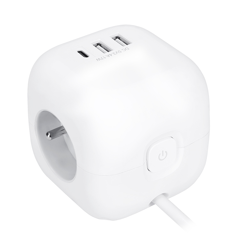 Predlžovací prívod v tvare kocky s dĺžkou strany 8 cm spája tri uzemnené zásuvky s detskou poistkou a USB nabíjačku s portami USB-C a USB-A. Vďaka 2m dlhému káblu poskytuje flexibilné využitie. Protišmykové podložky udržujú prívod stabilný na stole alebo pracovnej ploche. Podsvietený vypínač umožňuje jednoduché ovládanie všetkých zásuviek aj USB portov.