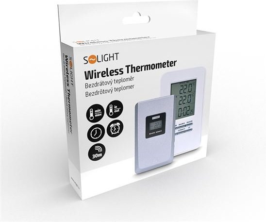 Digitálny teplomer na meranie vnútornej teploty (-9 °C až +50 °C) a vonkajšej teploty (-50 °C až +70 °C). Pamäť minimálnych a maximálnych teplôt na monitorovanie zmien. Súčasťou dodávky je 1 bezdrôtový snímač. Funkcia času a budíka na pohodlné používanie. Napájanie: hlavná jednotka 2x batérie AAA (nie sú súčasťou balenia), snímač 2x batérie AAA (nie sú súčasťou balenia). biela farba pre moderný vzhľad.