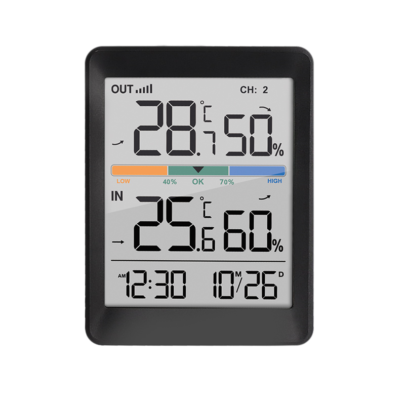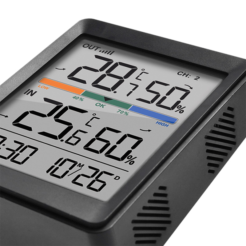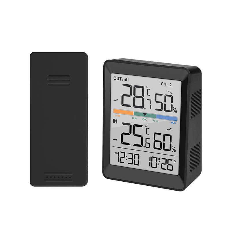 Digitálny teplomer a vlhkomer s meraním vnútornej teploty (-9,9 °C až +50 °C) a vonkajšej teploty (-40 °C až +70 °C). Meranie vnútornej a vonkajšej vlhkosti (20 % až 95 %). Pamäť minimálnych a maximálnych hodnôt teploty a vlhkosti, ukazovateľ trendu teploty a vlhkosti. Funkcie hodín, budíka a časového formátu 12/24, zobrazenie teploty v °C/°F. Súčasťou dodávky je 1 bezdrôtový snímač s dosahom až 60 m (bez prekážok). Napájanie: hlavná jednotka 2x batérie AAA, snímač 2x batérie AAA (nie sú súčasťou dodávky). farba: čierna.
