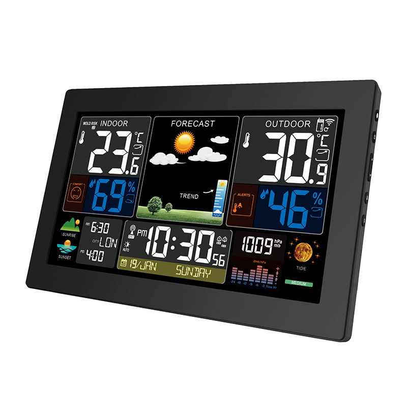 meteostanica, farebný displaj 19,3 x 11cm, meranie vnútornej a vonkajšej teploty, vlhkomer, barometer, fáza mesiaca, pravdepodobnosť dažďa, bezdrôtové čidlá, budíkZobraziť viac