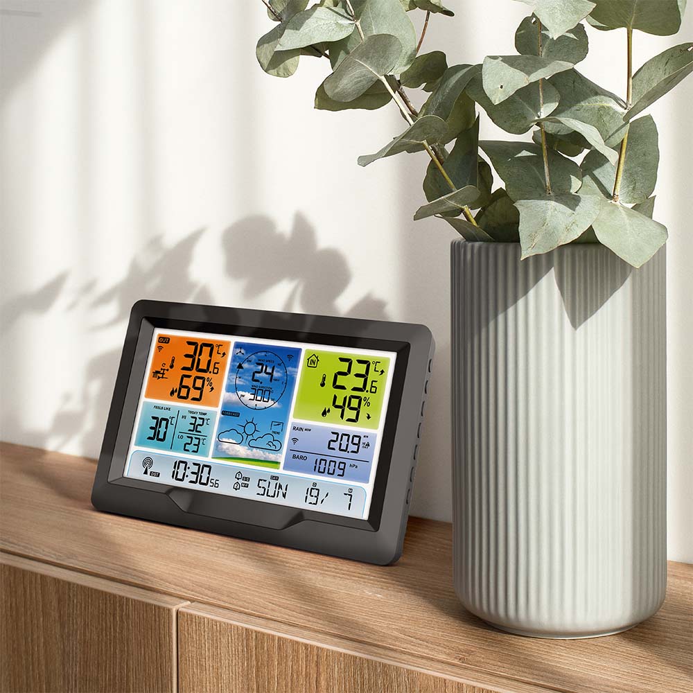 Na farebnom podsvietenom displeji s rozmerom 19 cm (17,0 × 9,4 cm) sa zobrazuje množstvo dôležitých informácií ako je vnútorná teplota (0 - 50°) a vonkajšia teplota (-40 - 70° C), vonkajšia a vnútorná vlhkosť vzduchu 20 - 95 %, čas, kalendár, fázy mesiaca a názov dňa.Technické parametre