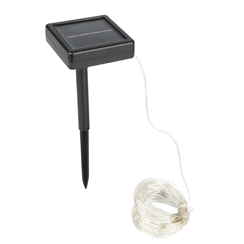Reťaz je napájaná Li-Ion batériou (3,7V, 800mAh), ktorá sa počas dňa dobíja pomocou solárneho panelu. Doba nabíjania je približne 9 hodín v závislosti od svetelných podmienok. Automatická aktivácia senzora nastáva pri osvetlení nižšom ako 10 lux, čo zaručuje jeho spoľahlivú funkciu aj pri slabom dennom svetle. Reťaz je chránená krytím IP44, čo ho robí odolným proti vlhkosti a vhodným na vonkajšie použitie. Čierne prevedenie štýlovo ladí s rôznymi exteriérmi aj dekoráciami.