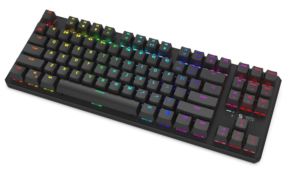 SPC Gear GK530 TournamentKompaktní mechanická klávesnice pro každého vášnivého hráče. Díky spínačům Kailh Blue nabízí klávesnice výbornou odezvu a výdrž přes 50 milionů stisků. Konstrukce klávesnice z kovu vykazuje jen tu nejvyšší možnou odolnost a stabilitu. Klávesy jsou RGB podsvícené a nabízí možnost vlastního nastavení. Klávesy jsou plně programovatelné a díky tomu lze klávesnici přesně individualizovat přesně podle potřeby hráče a hrané hry. Nechybí ani funkce Anti-Ghosting.
